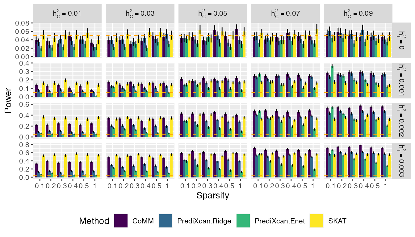 t1e_rej$Method <- ordered(t1e_rej$Method, levels = c("CoMM","PrediXcan:Ridge","PrediXcan:Enet","SKAT"))